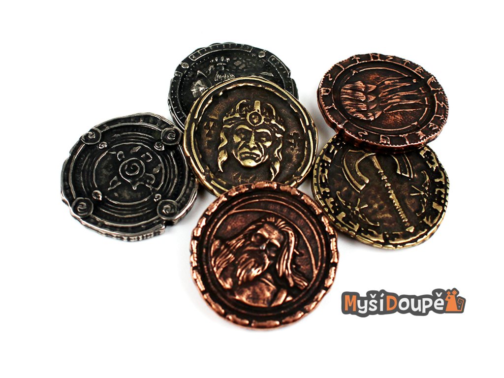 Kovové mince s barbarským motivem, použitelné i jako žeton prvního hráče nebo platidlo pro deskové a jiné hry.