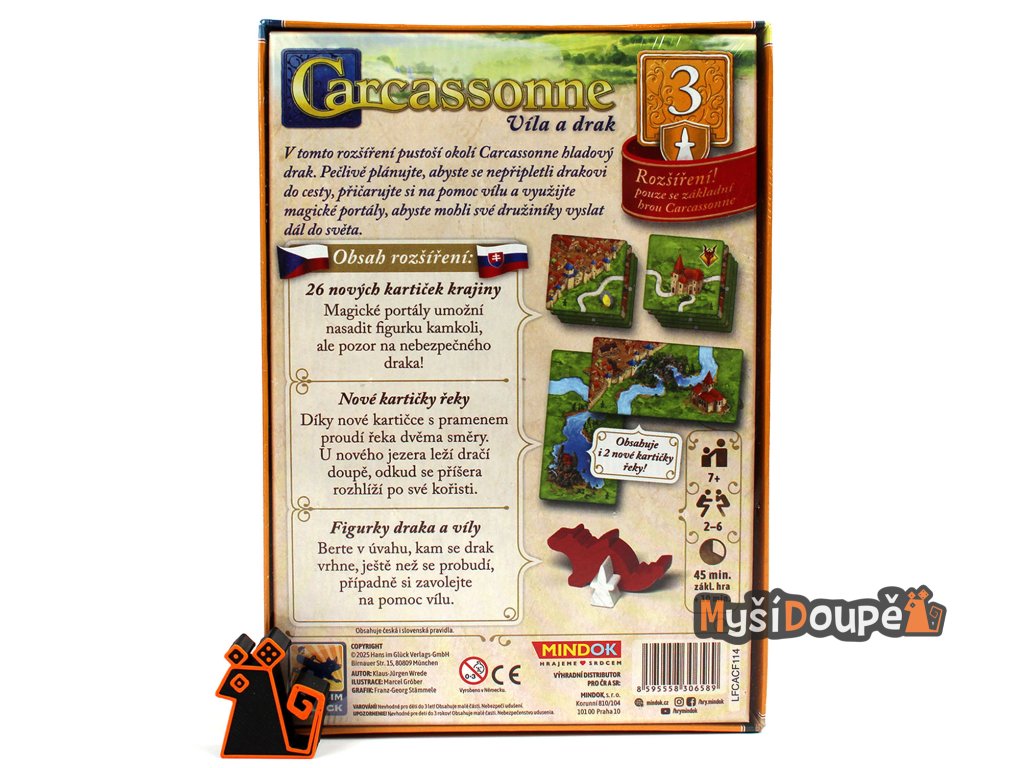 Pozor, v kraji řádí hladový drak! Rozšíření Víla a drak do hry Carcassonne přináší nové výzvy a magické prvky. Toto rozšíření nelze hrát samostatně. Pokud se drak probudí, vydává se na cestu a sežere všechny figurky družiníků, které mu stojí v cestě! Pečlivě proto plánujte, abyste se mu nepřipletli do cesty, nebo získejte pomoc kouzelné víly, která ochrání vaše figurky před jeho útokem a přinese vám i bonusové body.