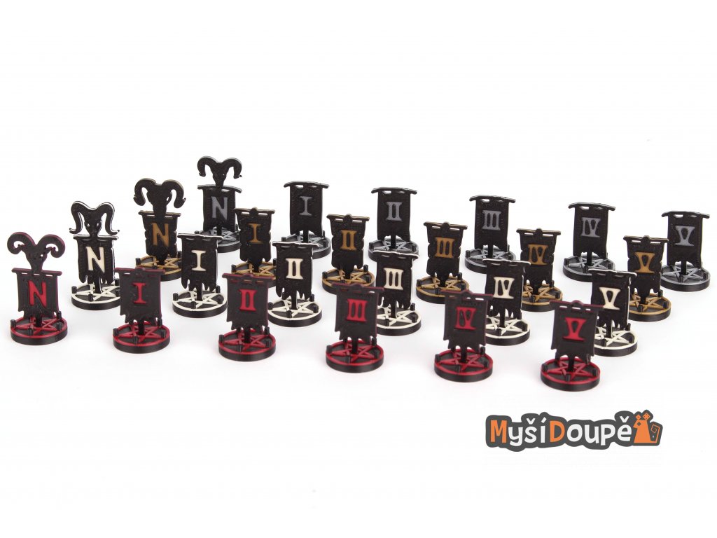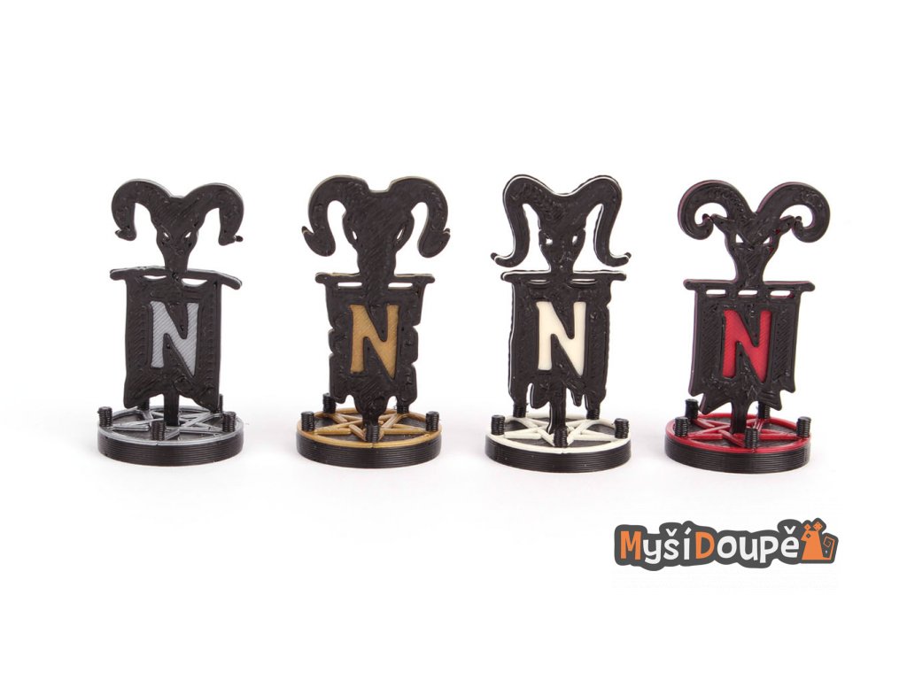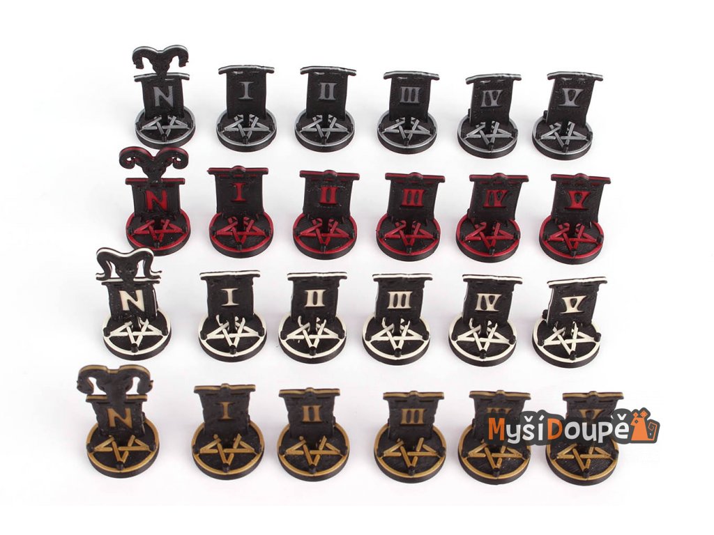 Prohnilé žetony v podobě vlajek s hodnotou N,1,2,3,4,5 pro označování jednotlivých skupin ve hře Cave evil. Podstavce obsahují kovové jádro, díky kterému jsou na herním plánu stabilnější.