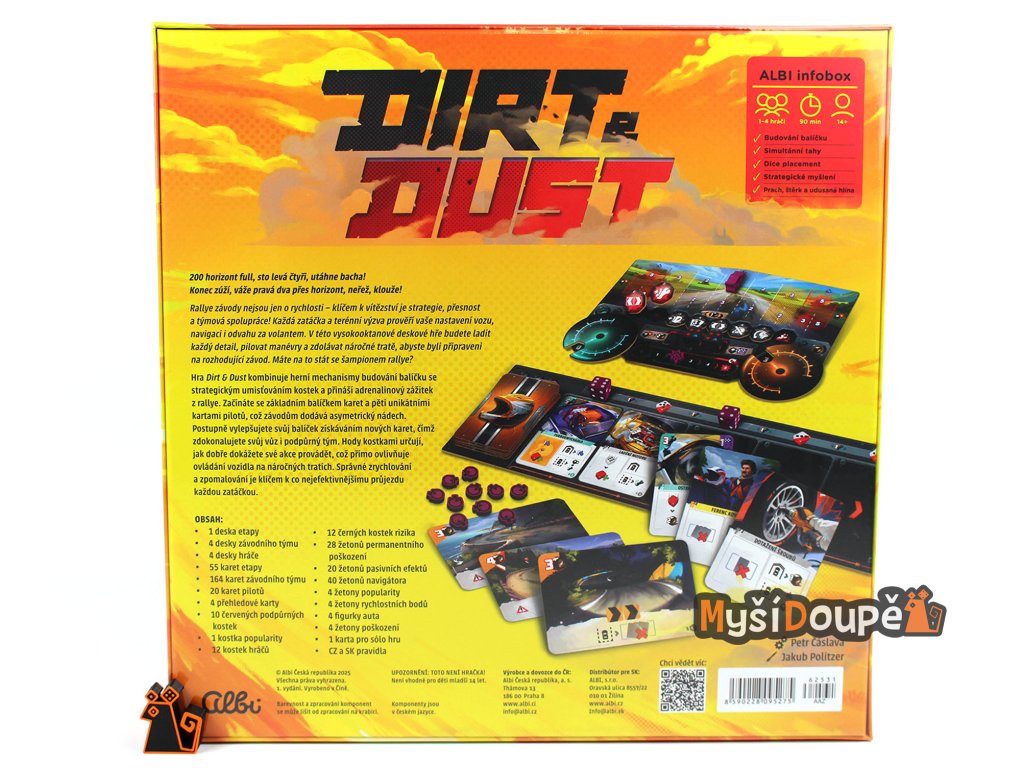 Hra Dirt & Dust kombinuje herní mechanismy budování balíčku se strategickým umisťováním kostek a přináší adrenalinový zážitek z rallye.