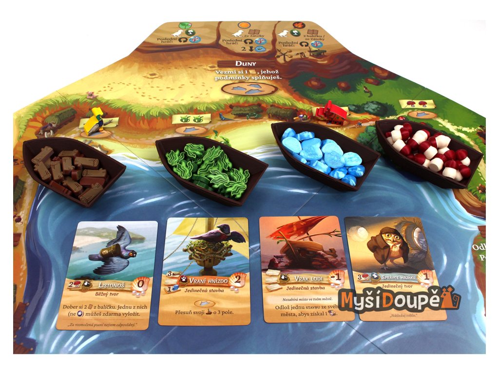 Miska na suroviny ve tvaru loďky pro hru Divukraj: Dálava. Miska pomáhá udržet pořádek na herním plánu a přidává stylový námořní prvek.