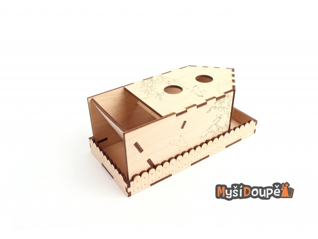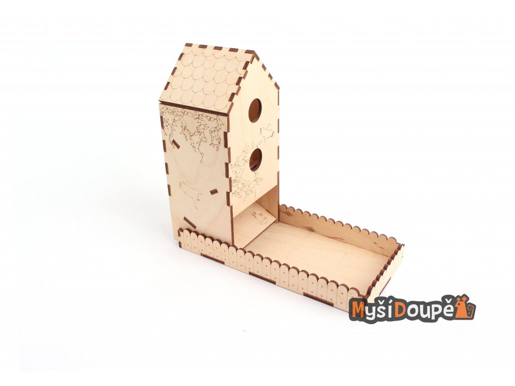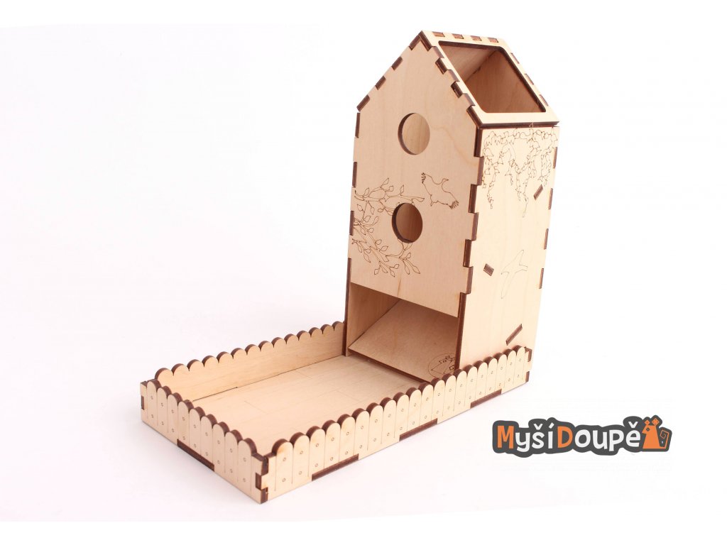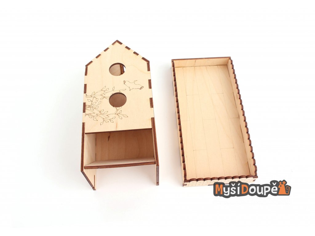 Budka je vyřezána z bukové překližky, dodávána je ve složeném stavu.