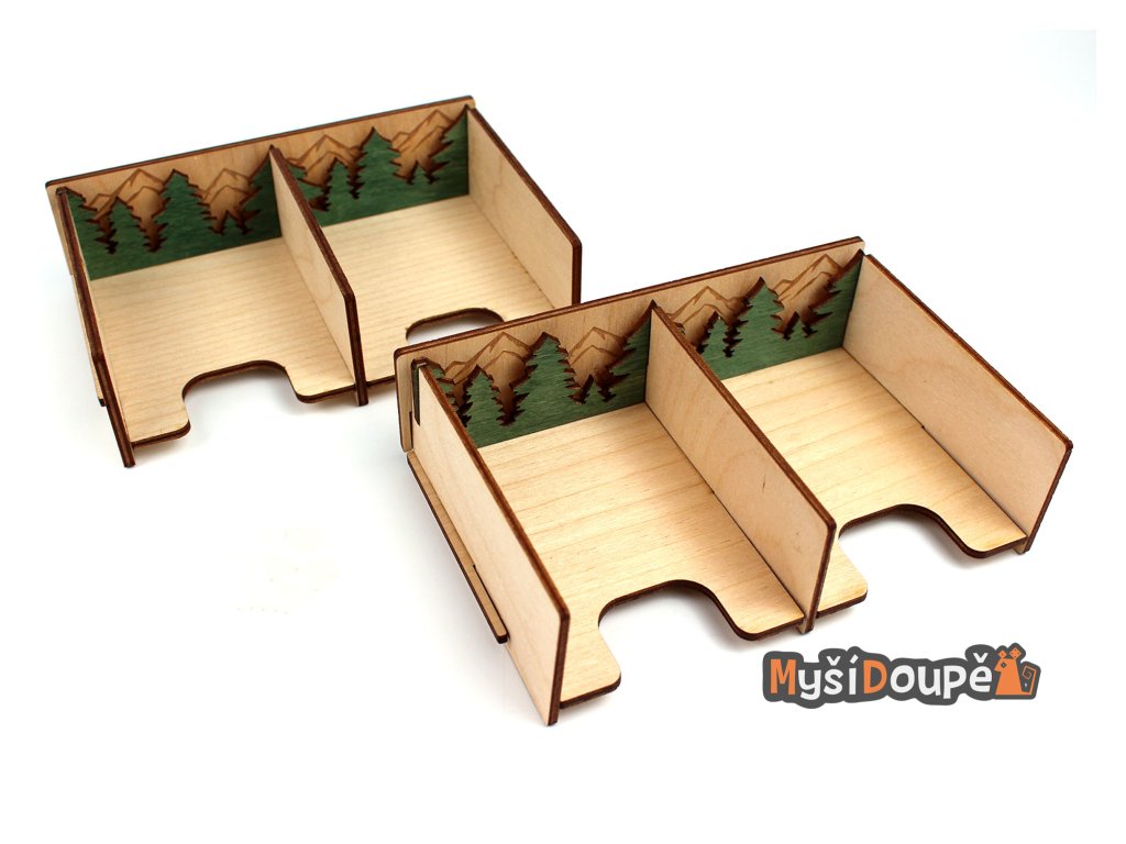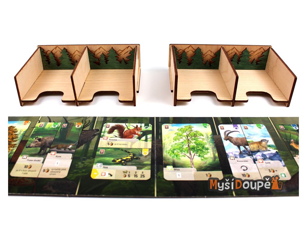 No more scattered cards on the table! With our set of two wooden card holders for the game Forest Shuffle, you’ll always keep your game organized. The holders are made from high-quality plywood and feature a beautiful forest and mountain design that perfectly matches the game’s atmosphere.