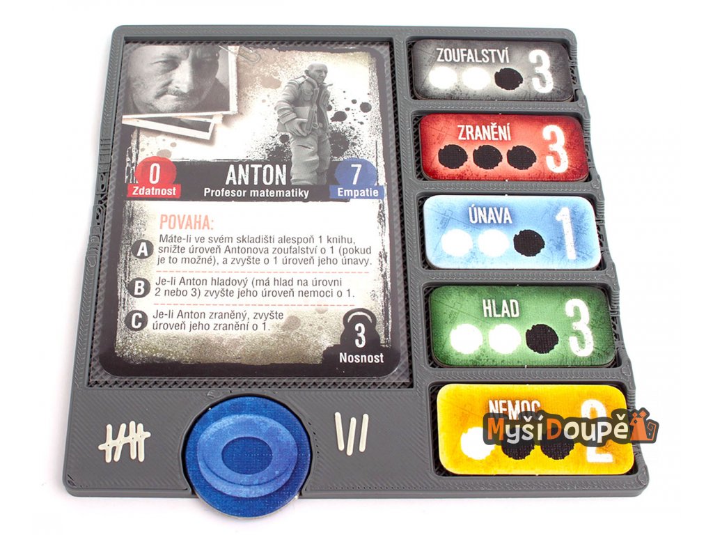 In the left part there are slots for five status tokens (Despair, Injury, Fatigue, Hunger and Disease).
