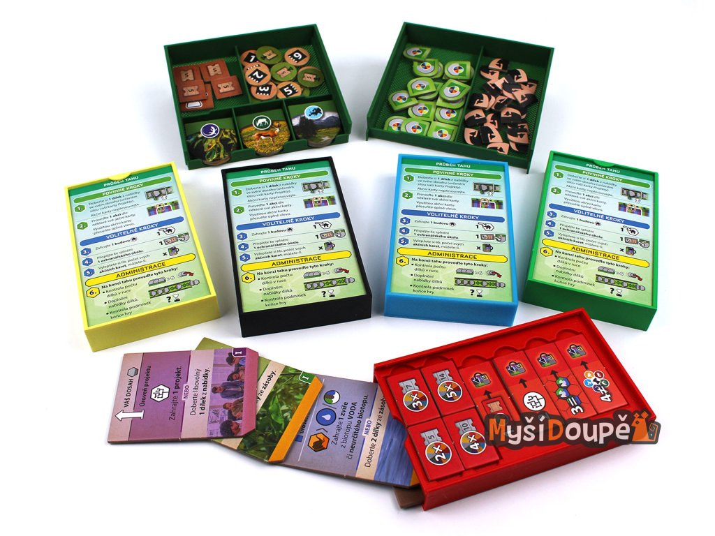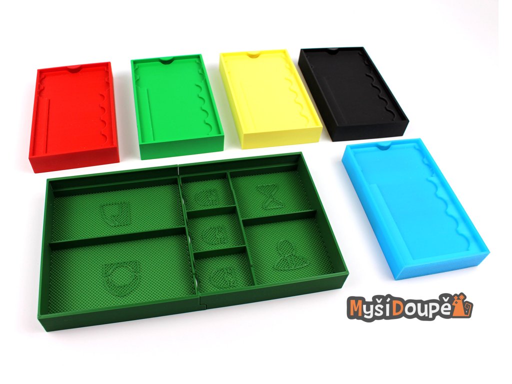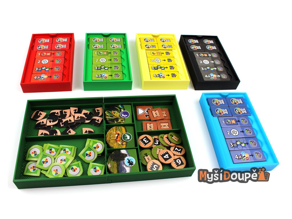 Barevné rozlišení pro hráče: Obsahuje 5 samostatných krabiček s víčkem v barvách hráčů (červená, zelená, žlutá, černá a modrá). Každý hráč dostane své komponenty přehledně připravené v jedné misce.