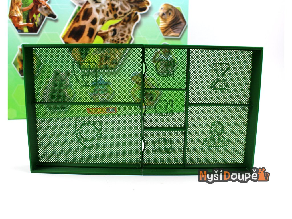 Speciální miska na žetony: Velký centrální organizér s ikonami v zelené barvě pojme všechny společné komponenty – žetony kapes, úkolů, ochrany, konce hry i speciální dílky pro sólo hru.