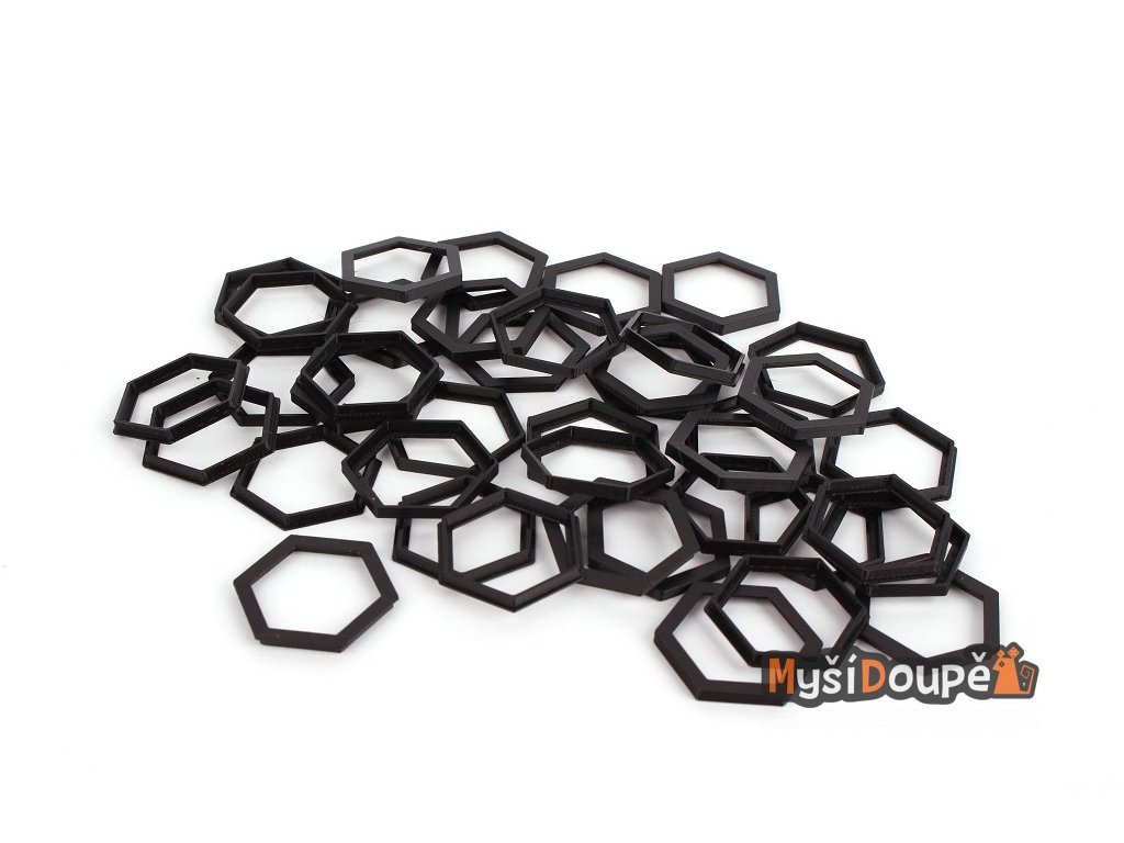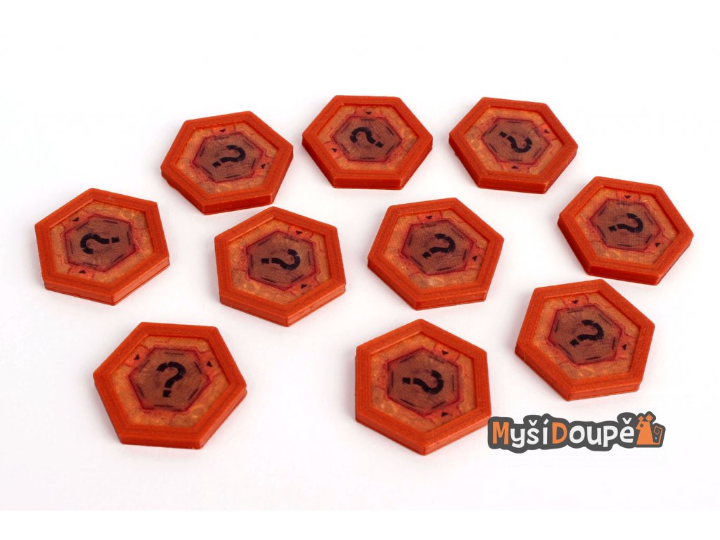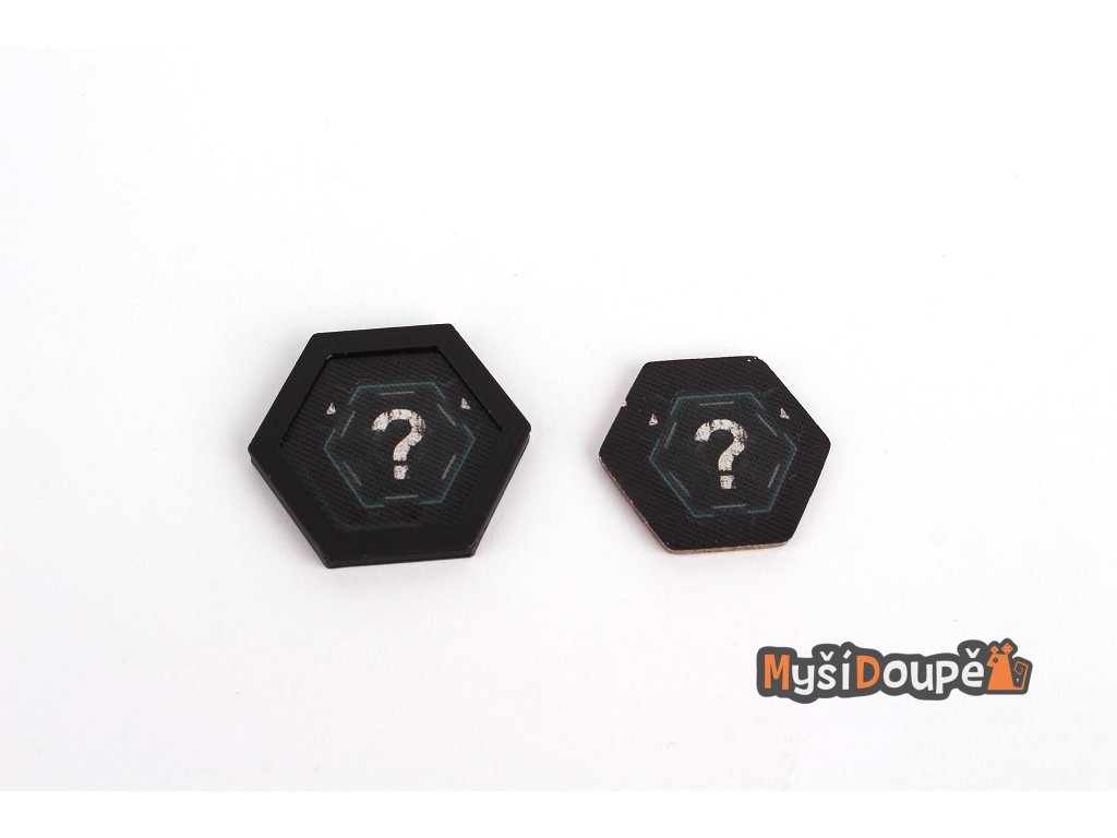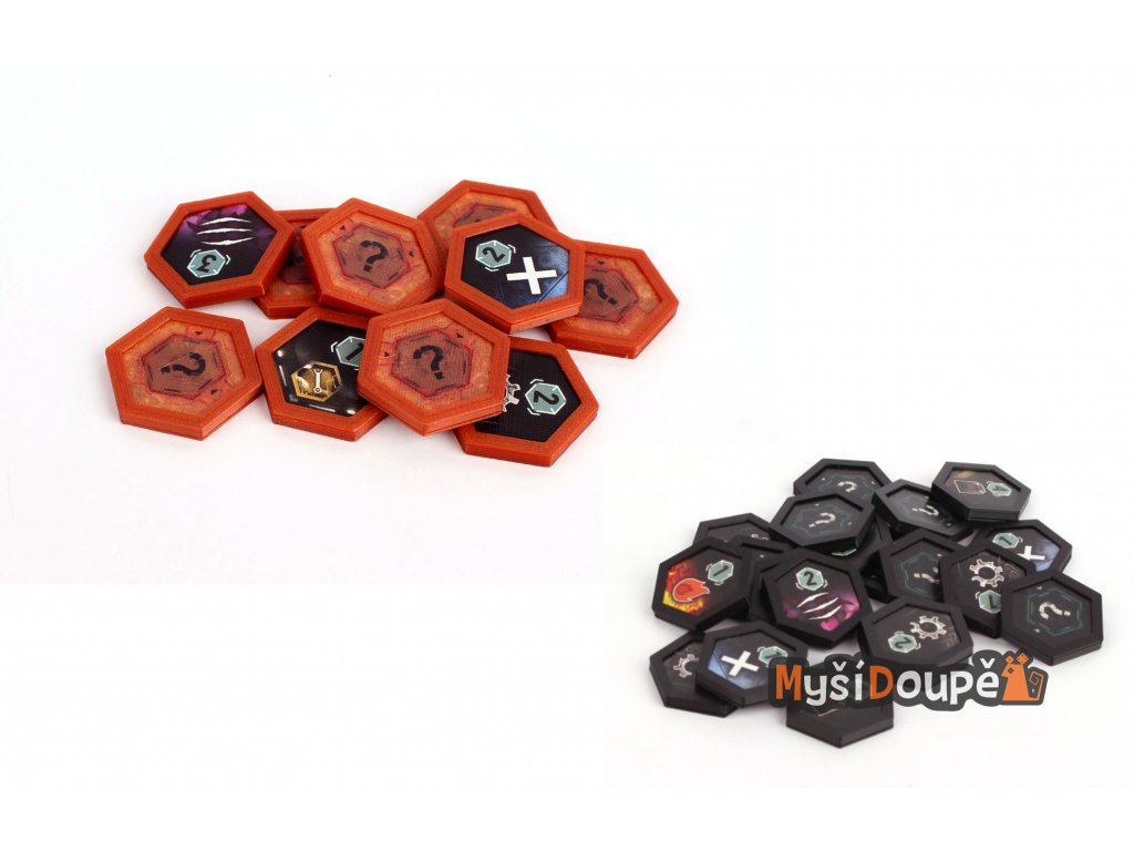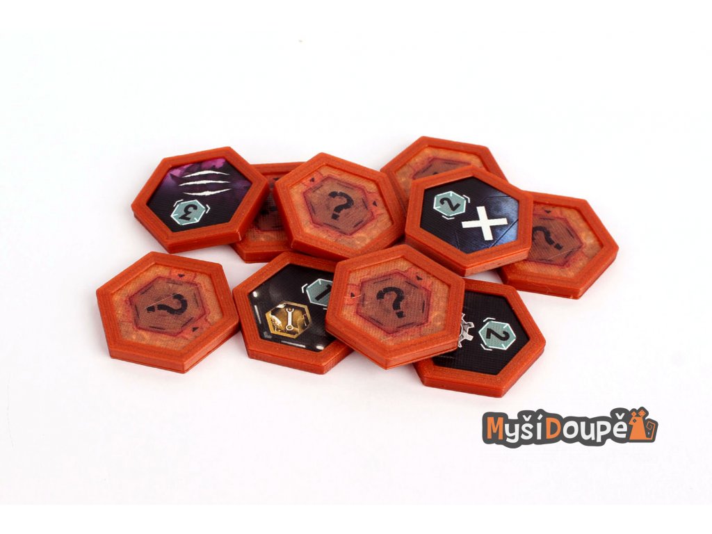 Zacvakávací hexové kryty chránící žetony průzkumu před opotřebením a zvyšují herní komfort.