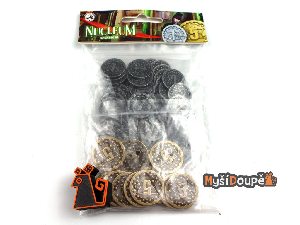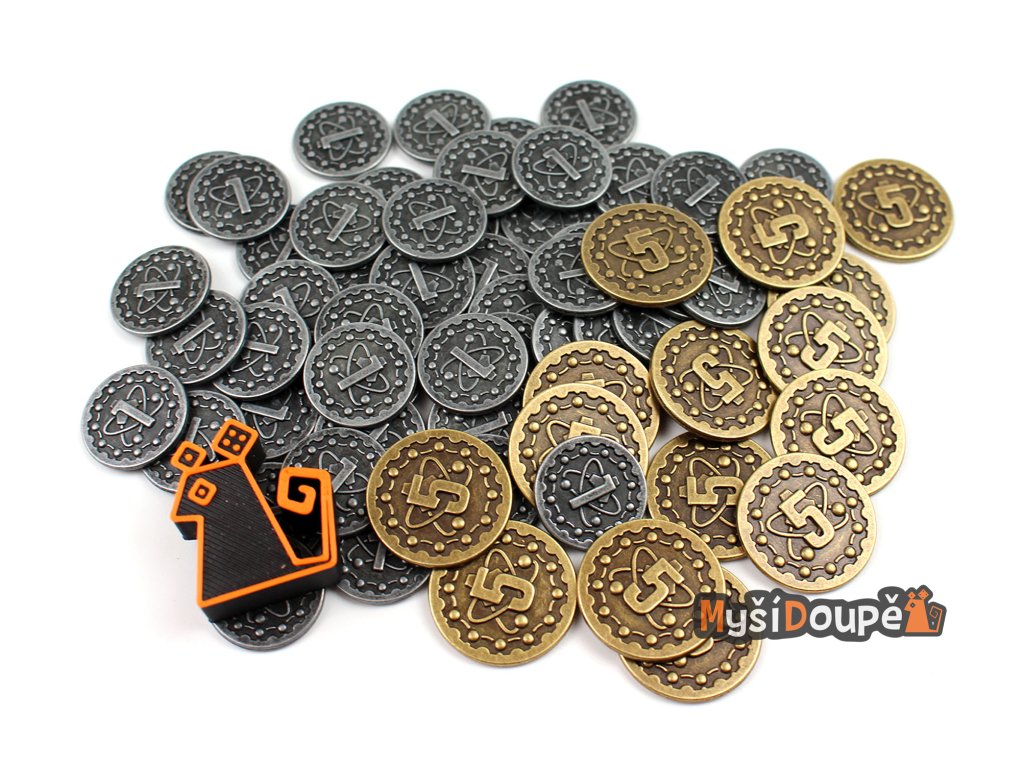 Kovové deluxe mince pro hru Nukleum v hodnotách 1 a 5.