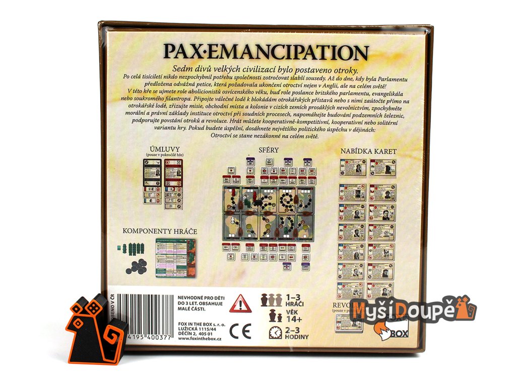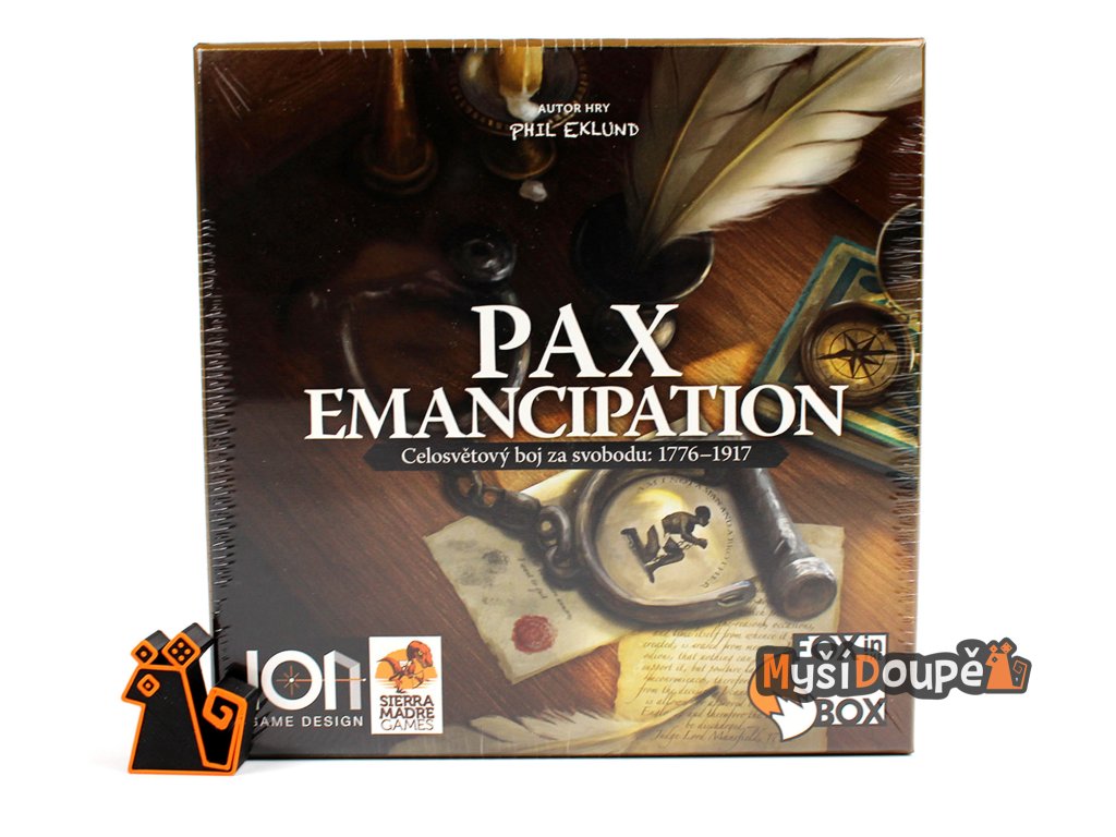 Pax Emancipation je karetní hra pro jednoho až tři hráče, každý z nich představuje jednu z trojice abolicionistických institucí, které se počátkem 18. století spojily s cílem ukončit otroctví po celém světě: