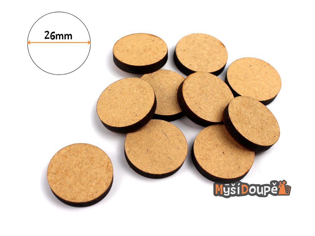 Podstavce pod figurky kulaté. Dřevotříska (MDF), lasercut. Sada obsahuje 20 kusů.