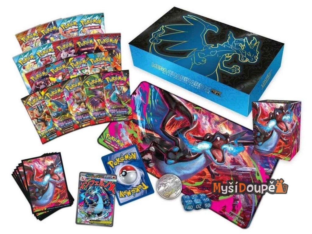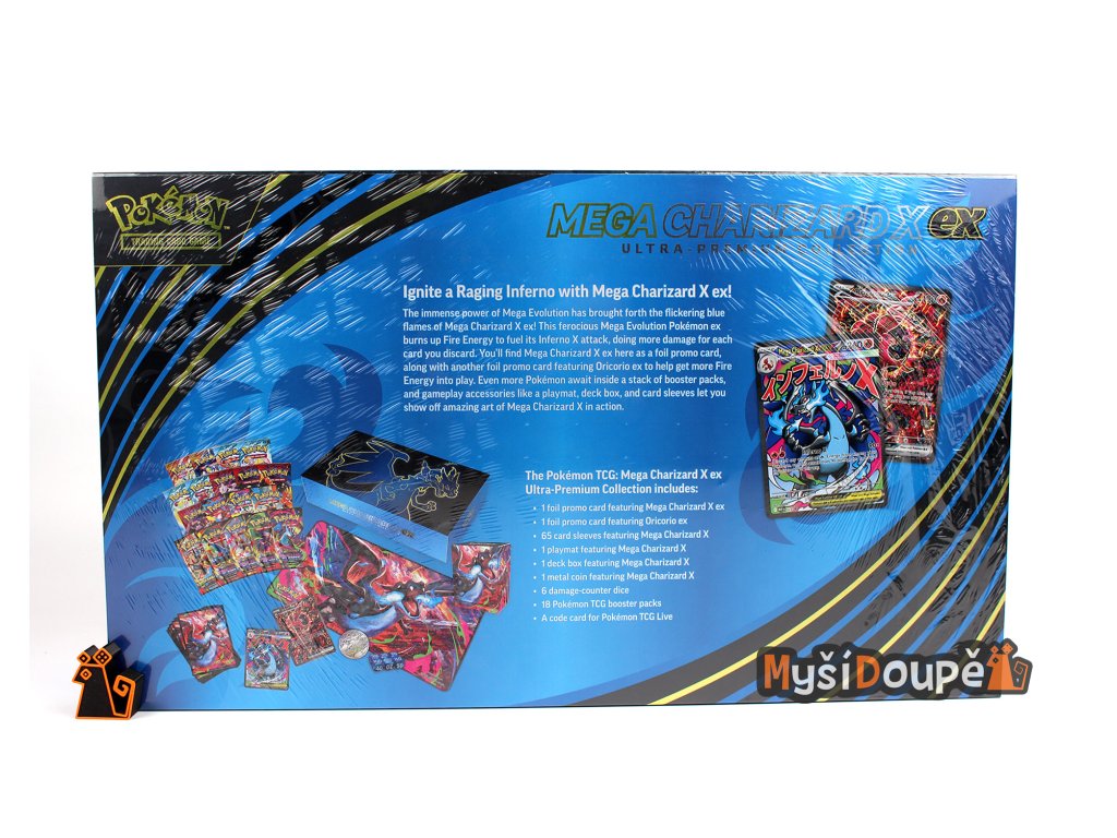 Limitovaná a exkluzivní kolekce Pokémon karet Mega Charizard X ex Ultra Premium Collection je skutečným sběratelským pokladem. Uvnitř najdete dvě foilové promo karty – Mega Charizard X ex (MEP #020) a Oricorio ex, dále 18 boosterů, herní podložku, 65 obalů na karty, sběratelskou krabičku a další doplňky.