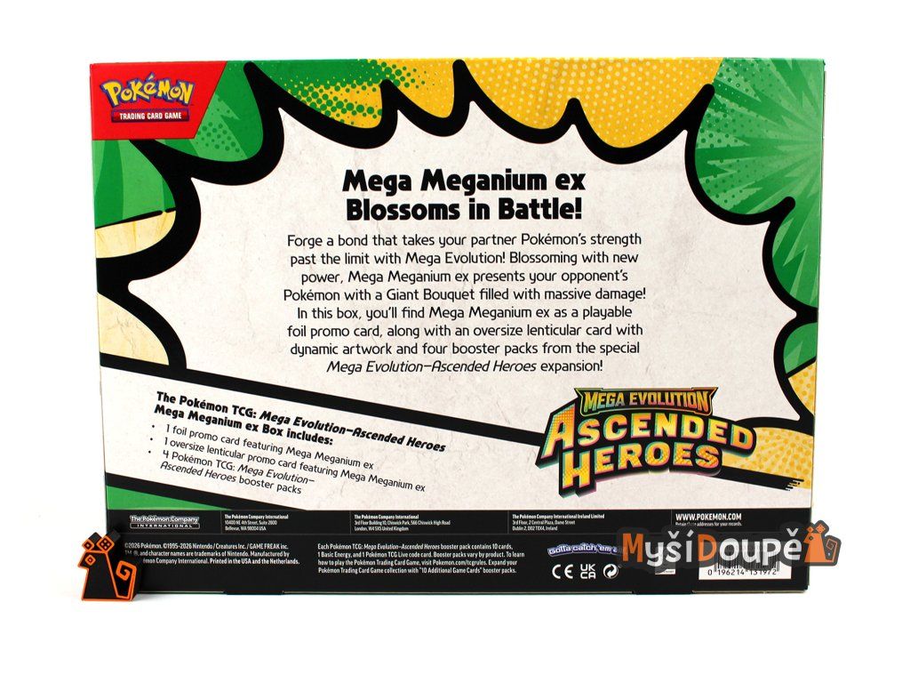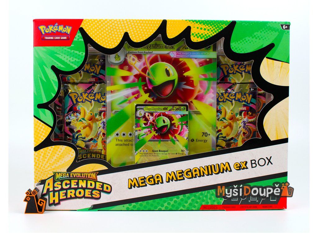 - 1x Foilová promo karta: Mega Meganium ex, Mega Emboar ex, nebo Mega Feraligatr ex.