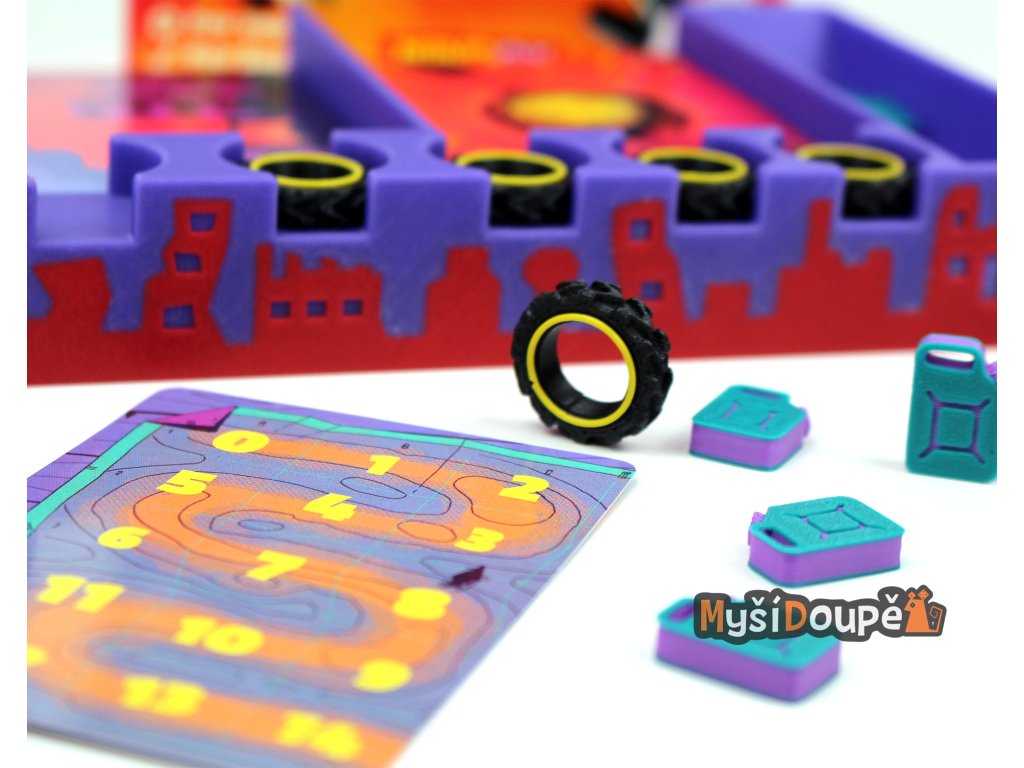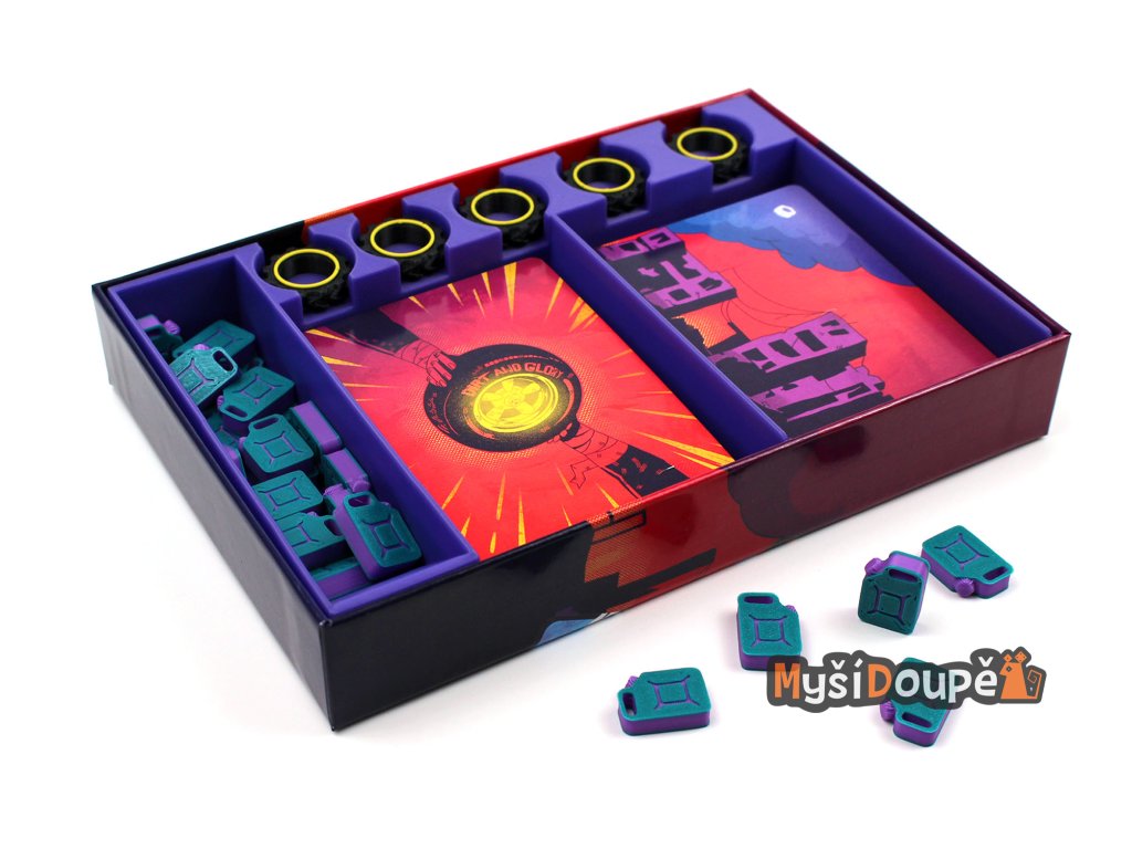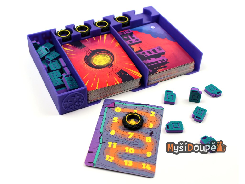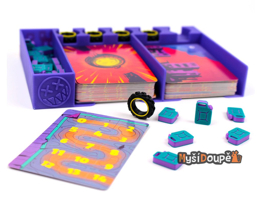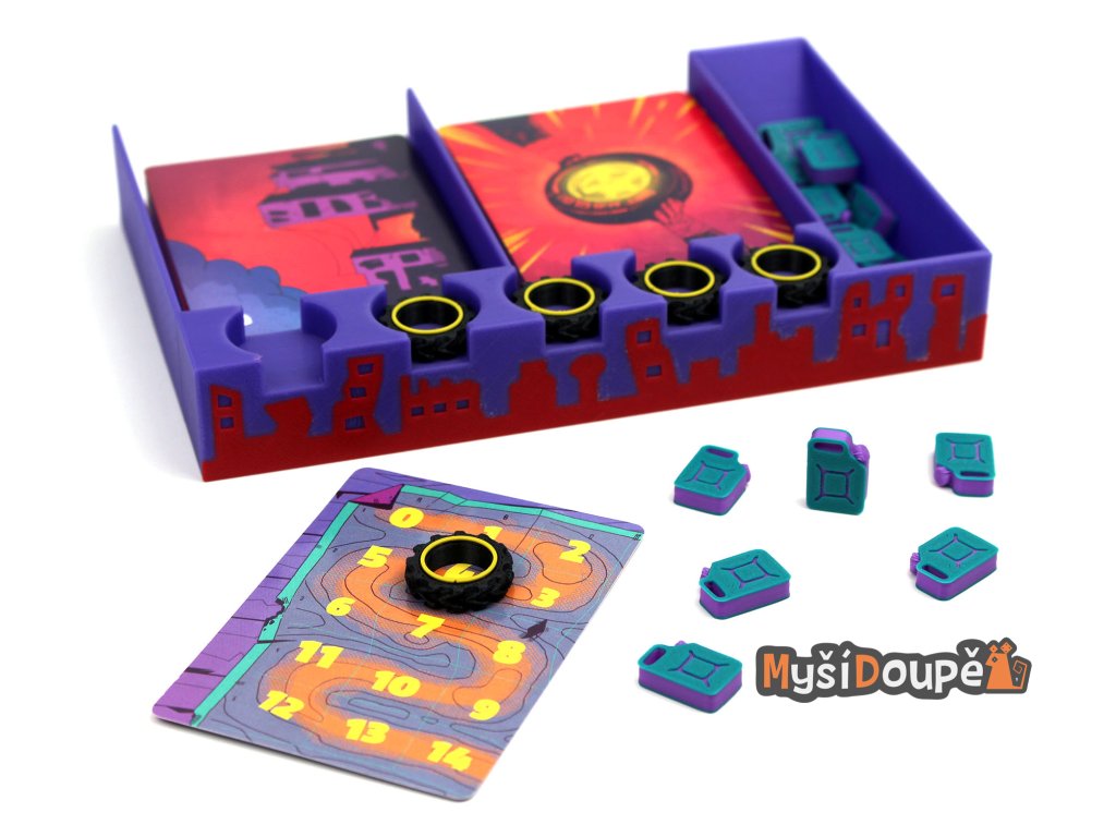Tématický insert a žetonky pro hru Zběsilá jízda. Insert je vybaven i žetony ve tvaru kanystrů s benzínem a žetony pneumatik.